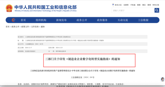 2024 年底,工信部、发改委、财政部联合发布《制造业企业数字化转型实施指南》,明确要求 “构建贯穿产品全生命周期的质量管控体系,发展质量智能检测、分析与追溯能力”。